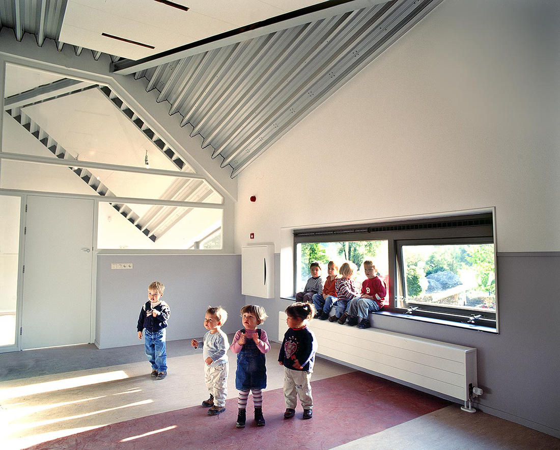 這座建筑有種異域般的永恒之美——他像一個即現(xiàn)代又古老的農舍,鋁制的現(xiàn)代屋頂與質樸的的木質材料形成對比,產生獨特的視覺效果。室內空間寬敞。空間內傾斜的視角也許對成年人而言是十分奇怪的,但是對兒童而言完全符合他們的天性。它激發(fā)了兒童的情感——一種孩子們不炫耀、不張揚的行為需要。